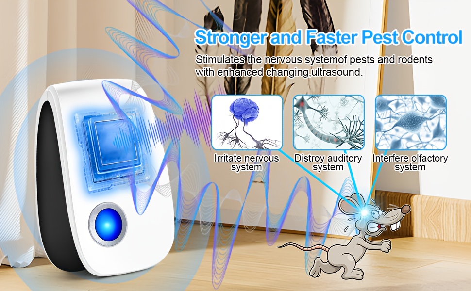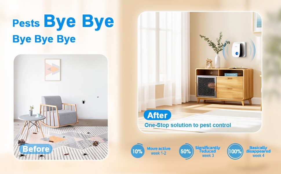 A continuous method for pest control. Within 3 to 5 days, the pests will be significantly affected and abandon their hiding spots. You may notice that they are much more active than before. In the first two weeks, you might experience some nerve damage due to the pests. You will observe a notable decrease in their numbers. During weeks 3 to 4, the ultrasonic effects will disrupt the pests, causing them to disappear. To prevent their return, it is highly recommended to continue using it throughout the year.