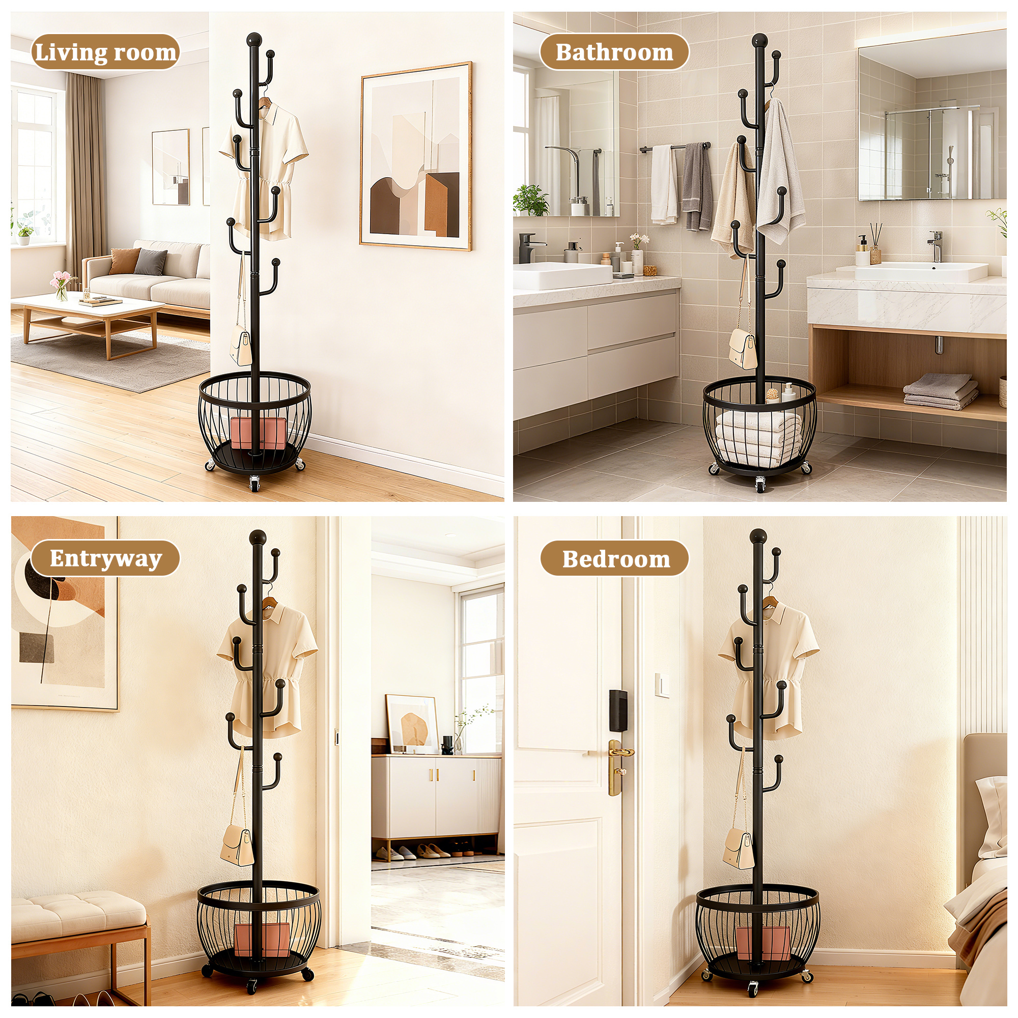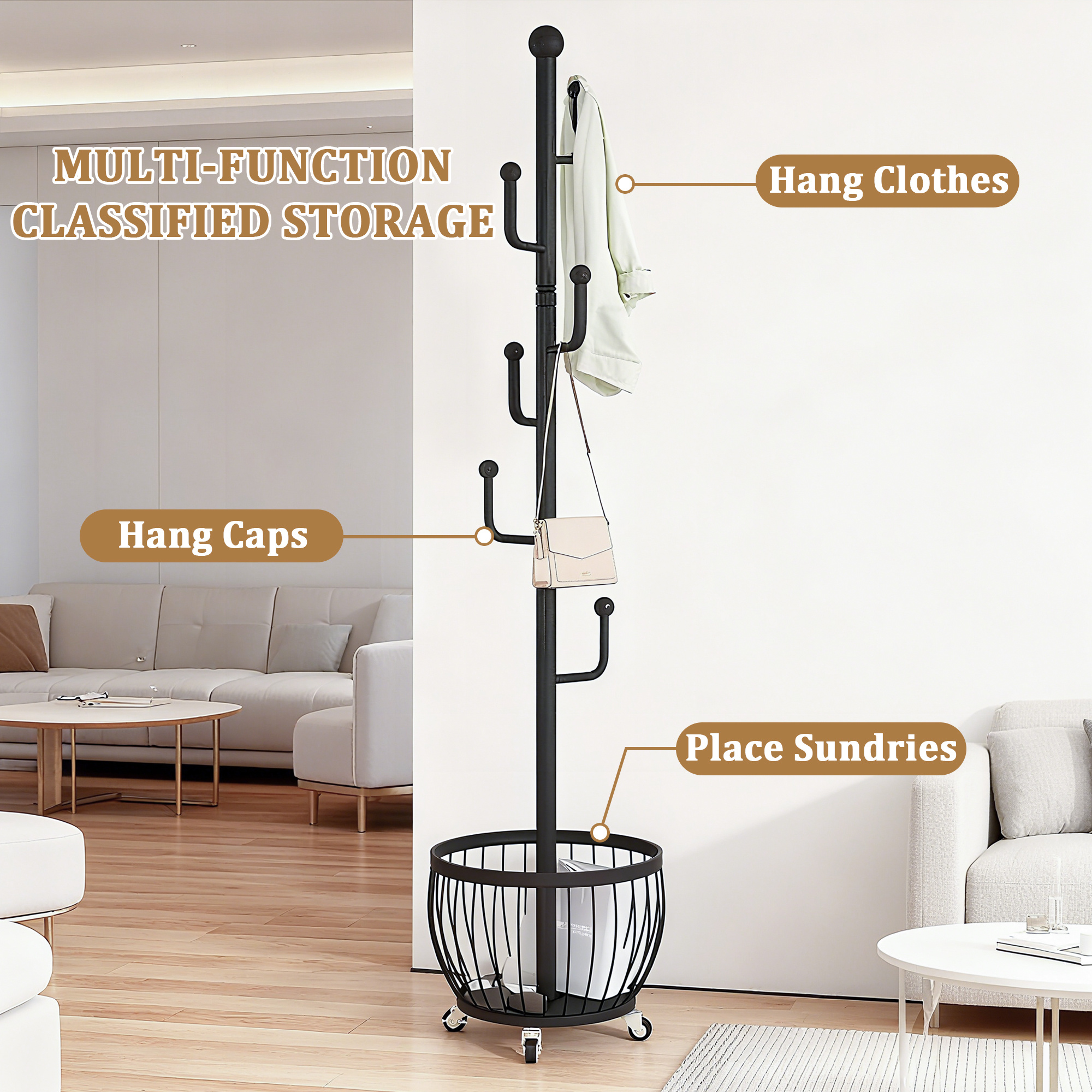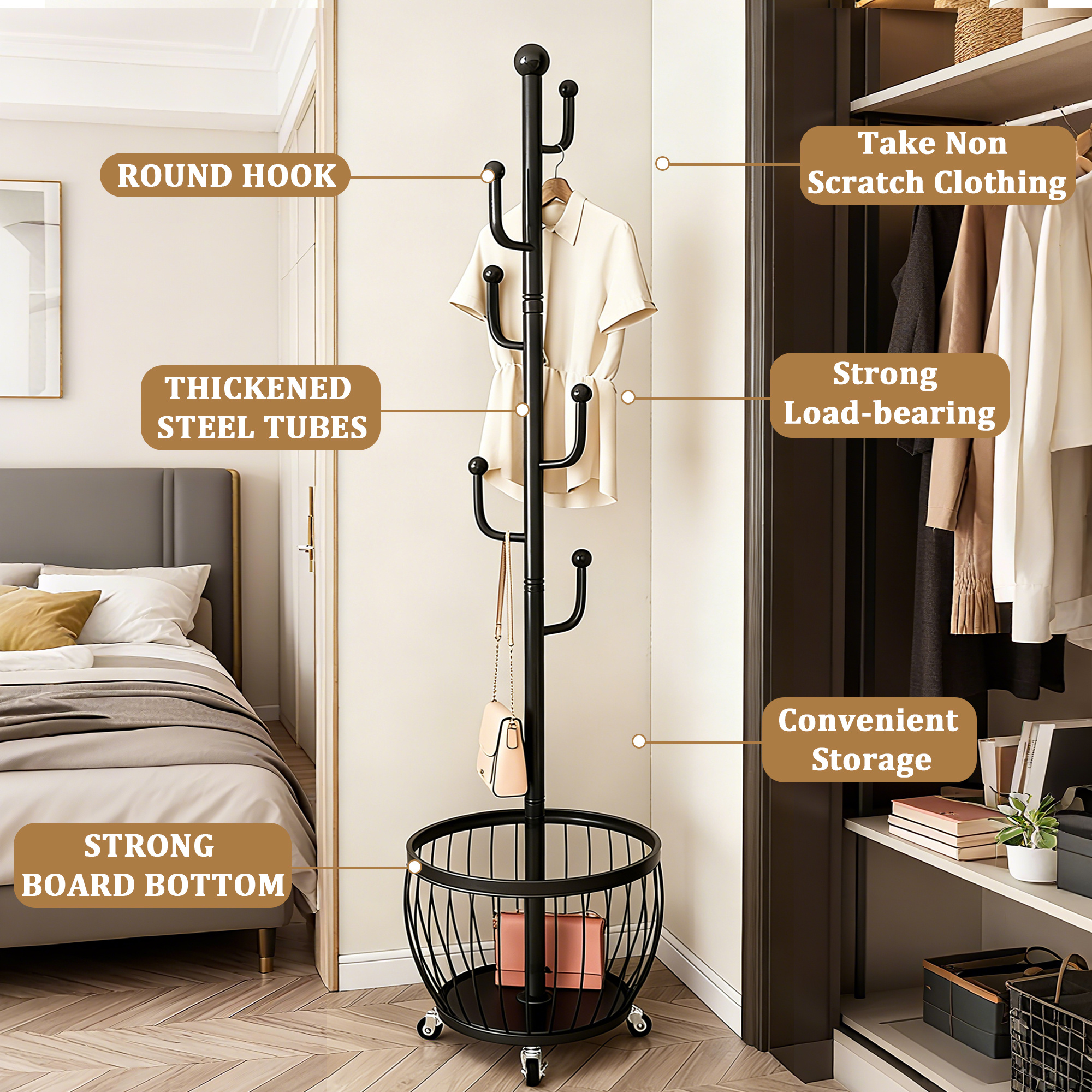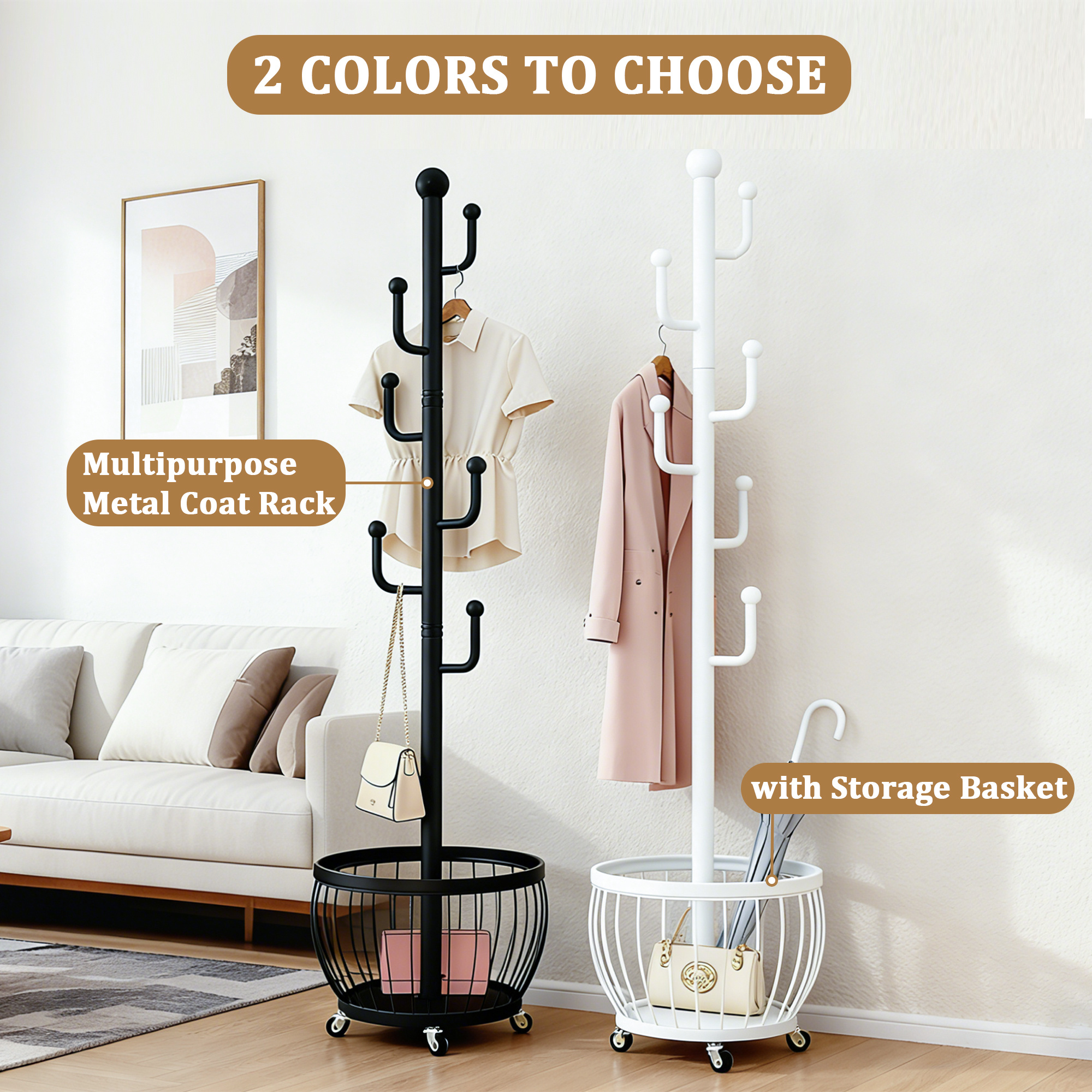 The Modern Metal Coat Rack with Storage Basket is a versatile and stylish solution for organizing your clothes and accessories. Featuring a durable metal frame, this coat rack ensures stability and longevity. The rotatable design provide easy access and organization, making it perfect for use in bedrooms, living rooms, and entryways.