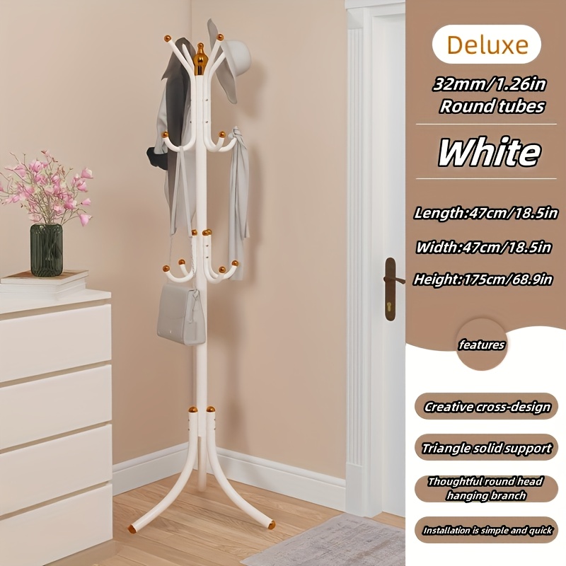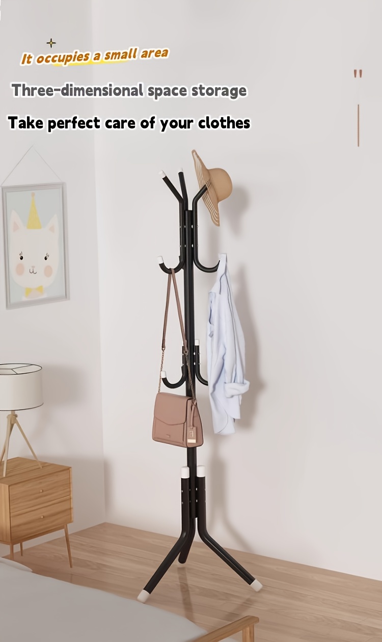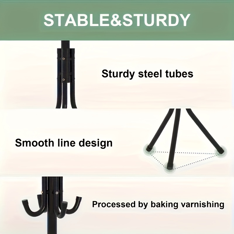 · The coat rack features a tripod base design, requiring no installation or mounting to use after assembly.