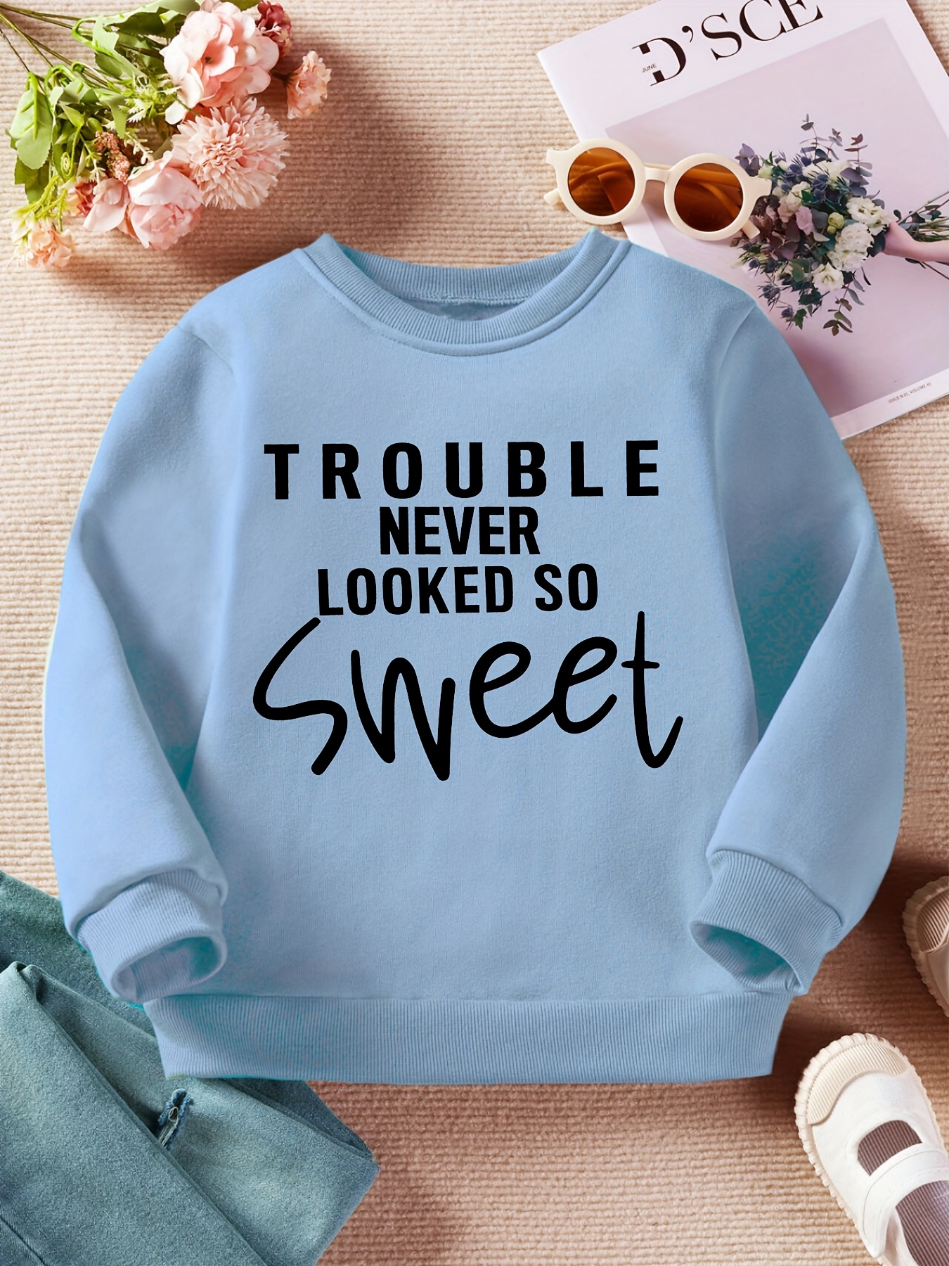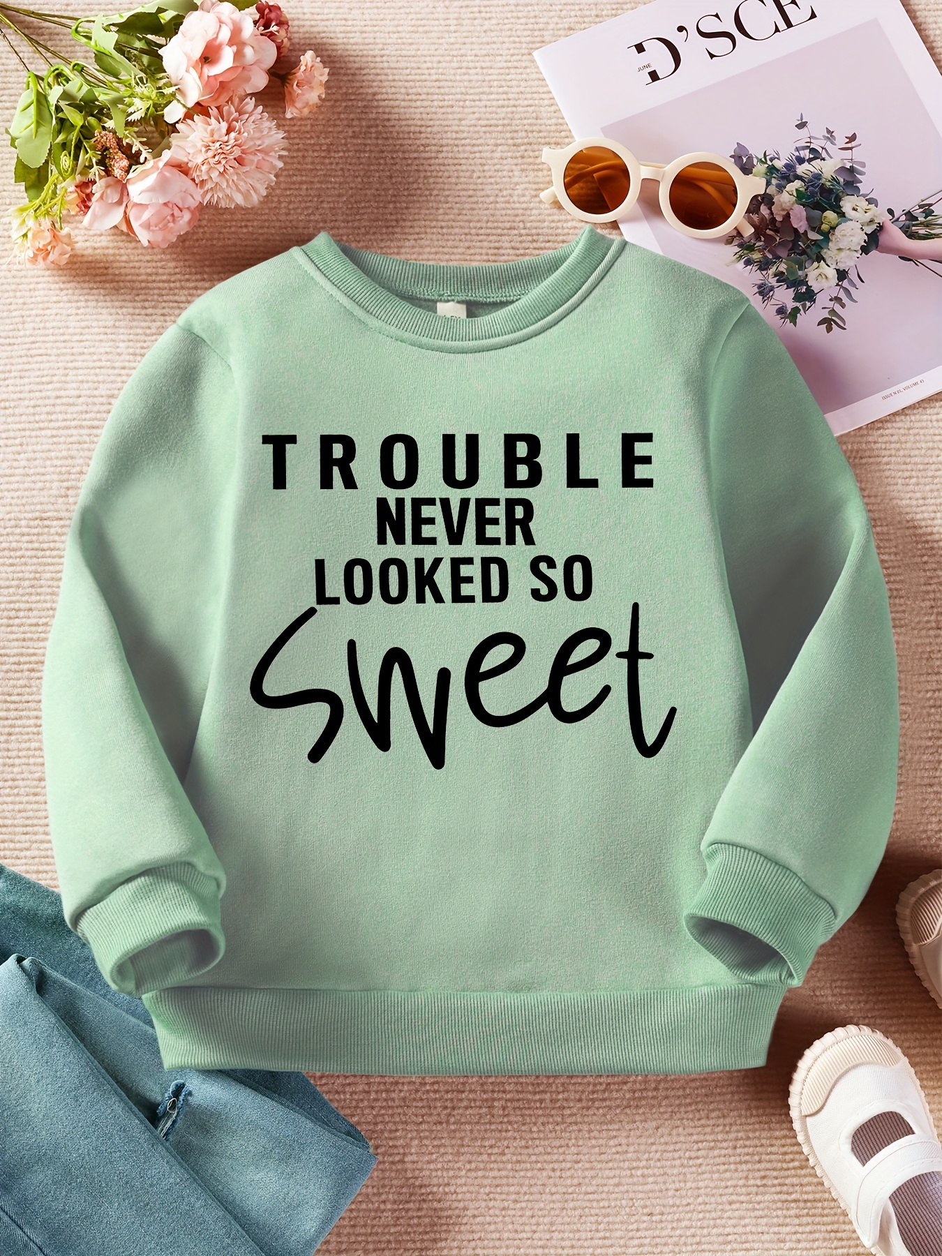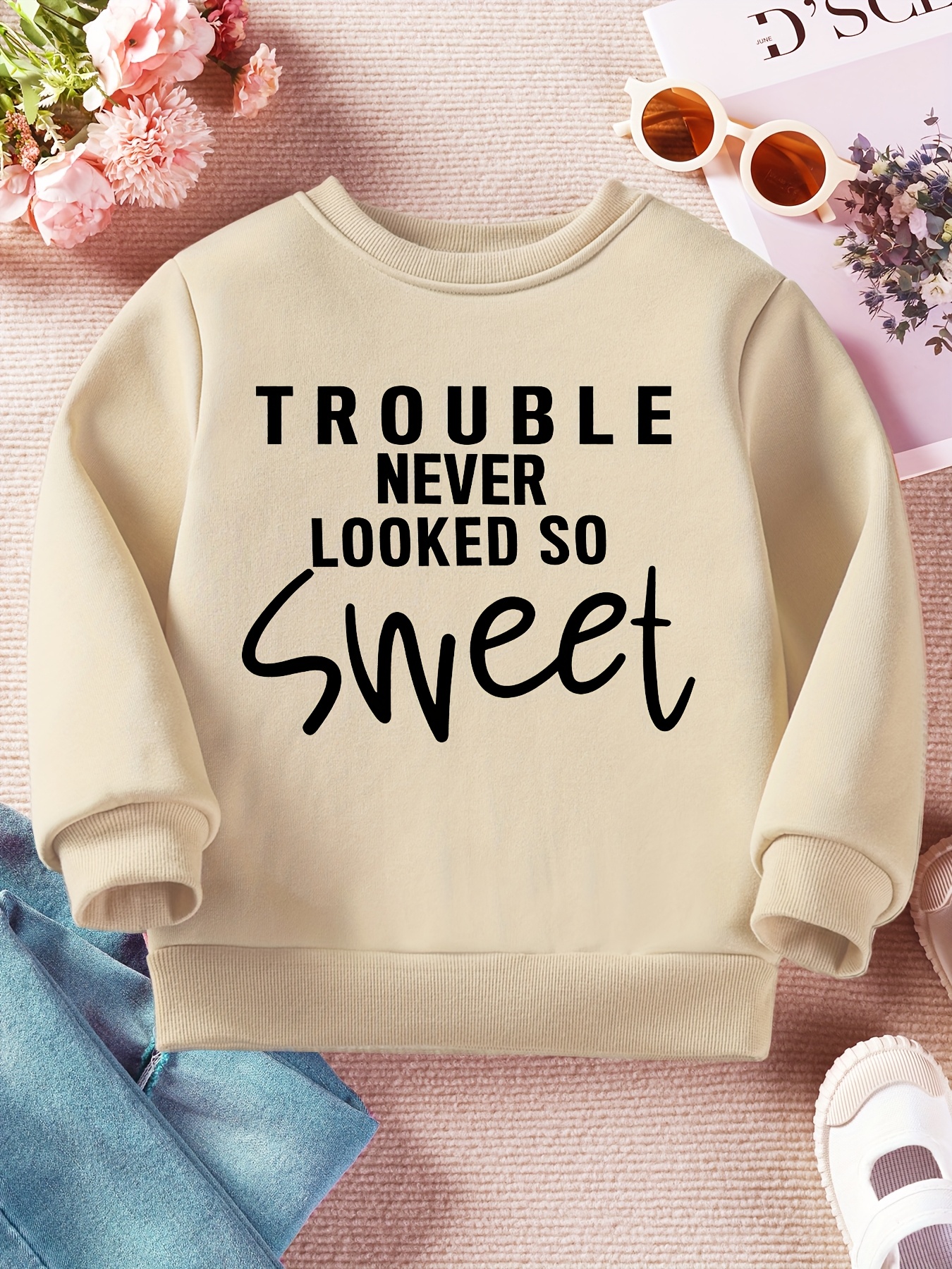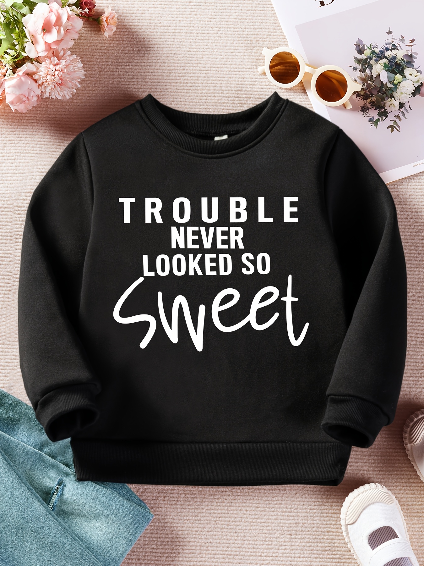 Stylish Lettering| Boys' Cozy Fleece-Lined Sweatshirt - "Trouble Never Looked So