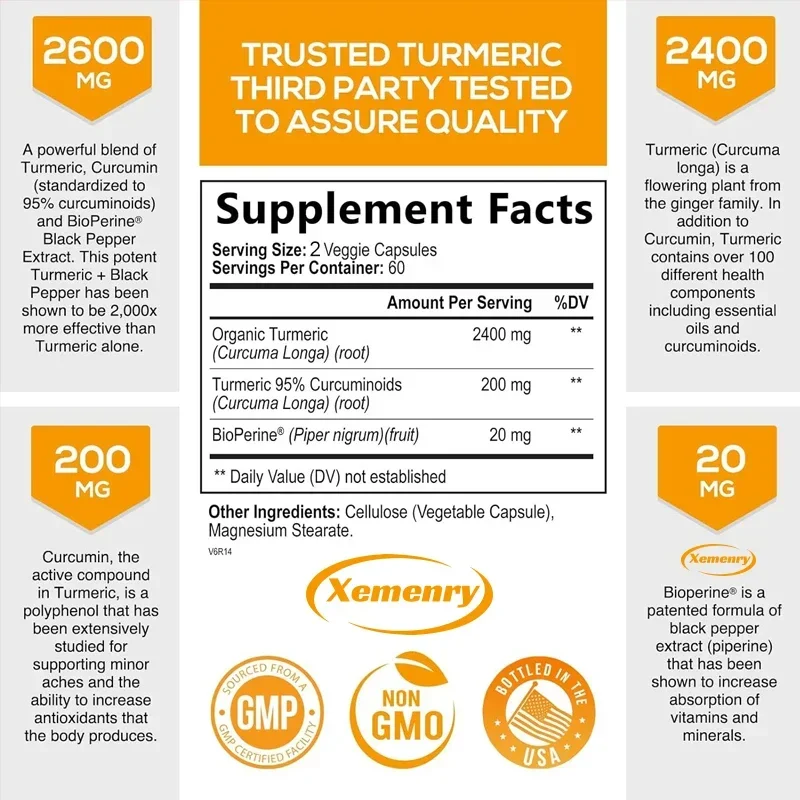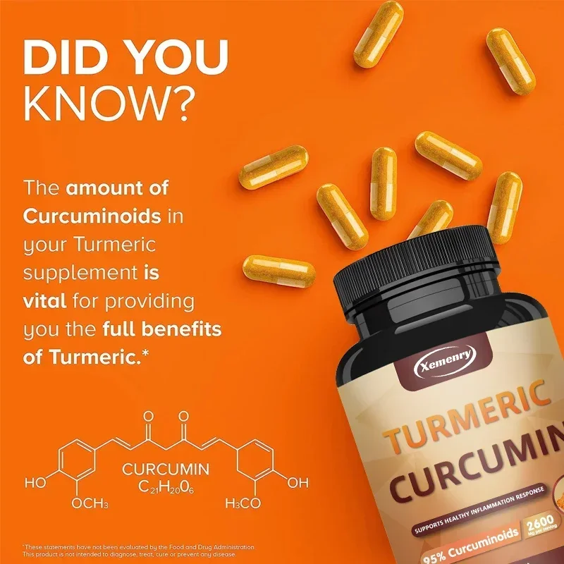 POWERFUL CURCUMIN: Our premium Turmeric Curcumin Complex 2600 mg; Contains 95% standardized curcuminoids; Added 20 mg of piperine (black pepper) for maximum absorption and bioavailability.