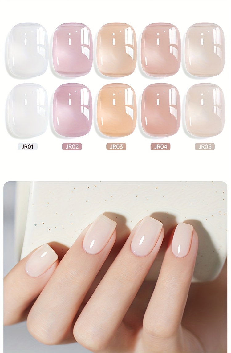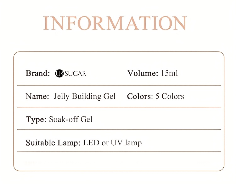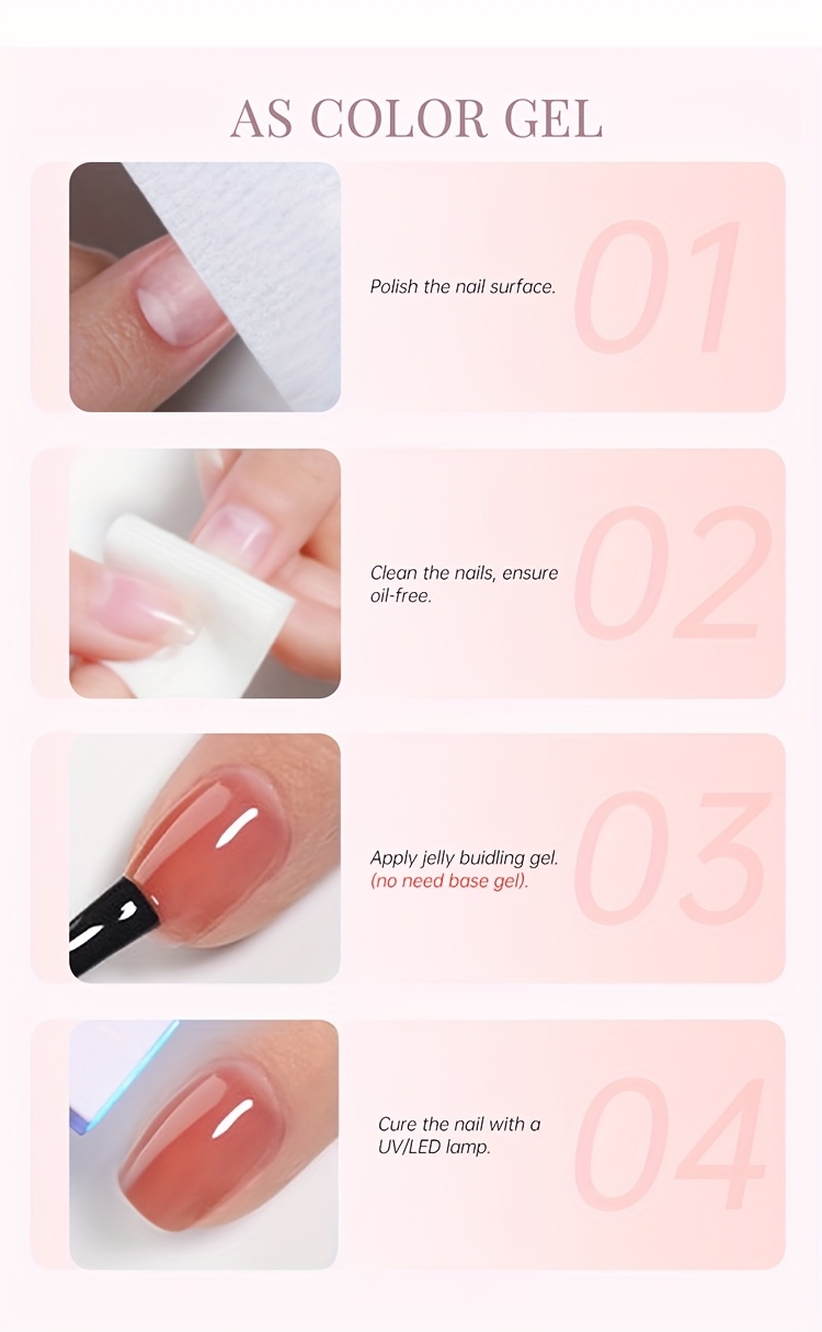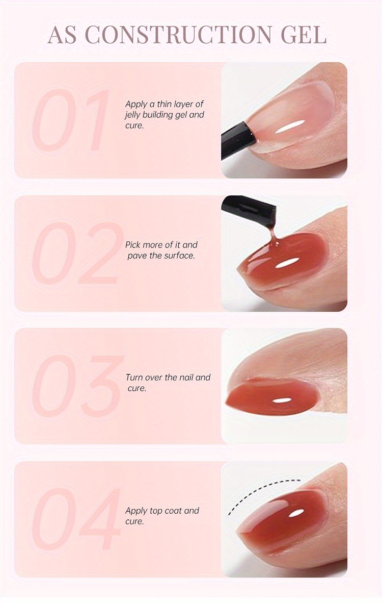 How To Use Our Nail Polish?As Color Gel1.Polish the nail surface.2.Clean the nails, ensure oil-free.3.Apply jelly buidling gel.(no need base gel).4. the nail with a /LED lamp.As Construction Gel1.Apply a thin layer of jelly building gel and.2.Pick more of it and pave the surface.3.Turn over the nail and.4.Apply top coat and.