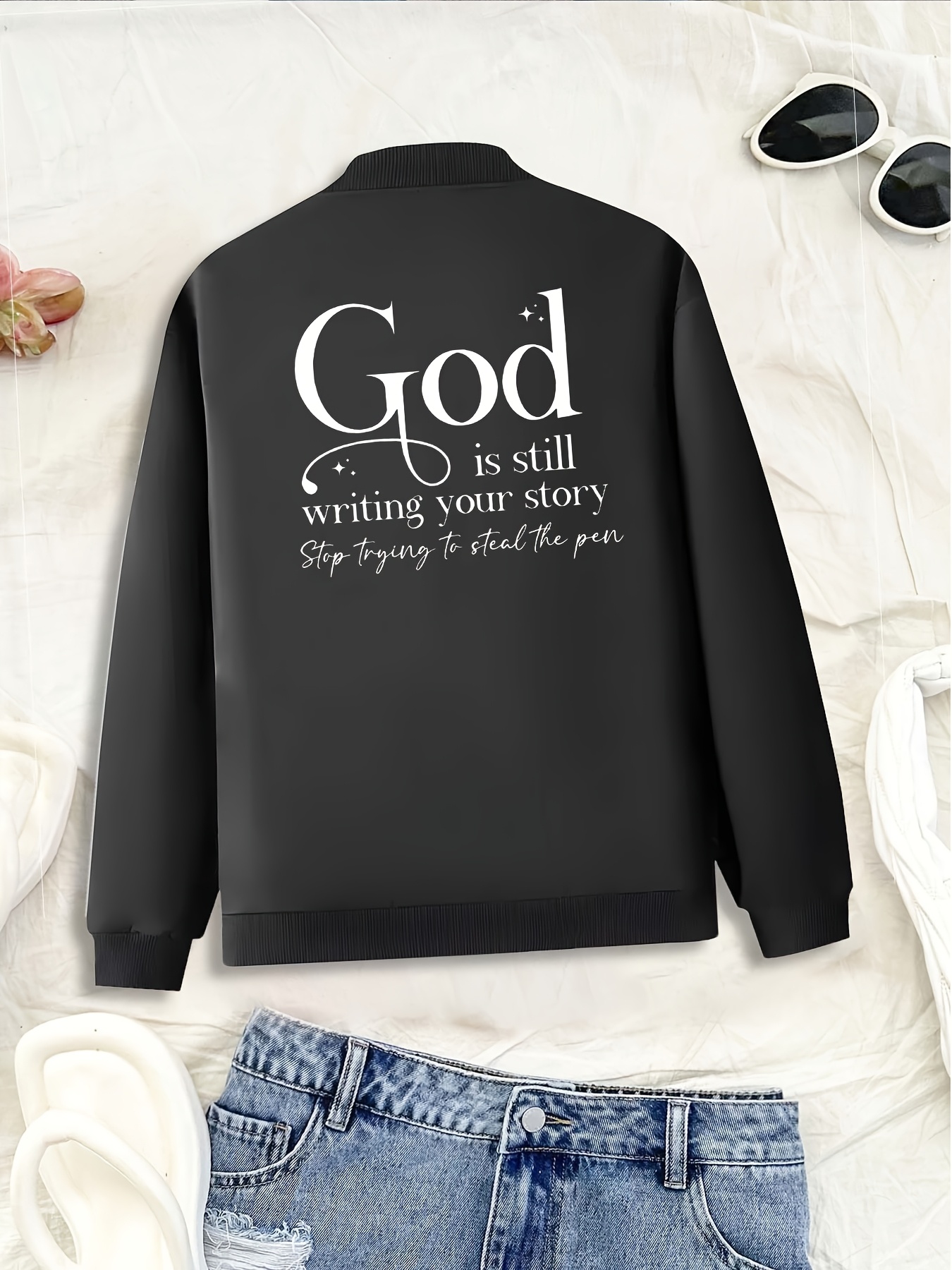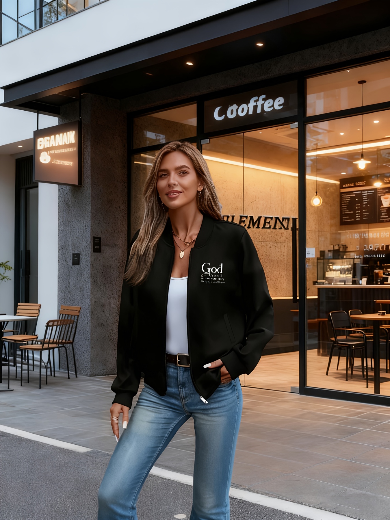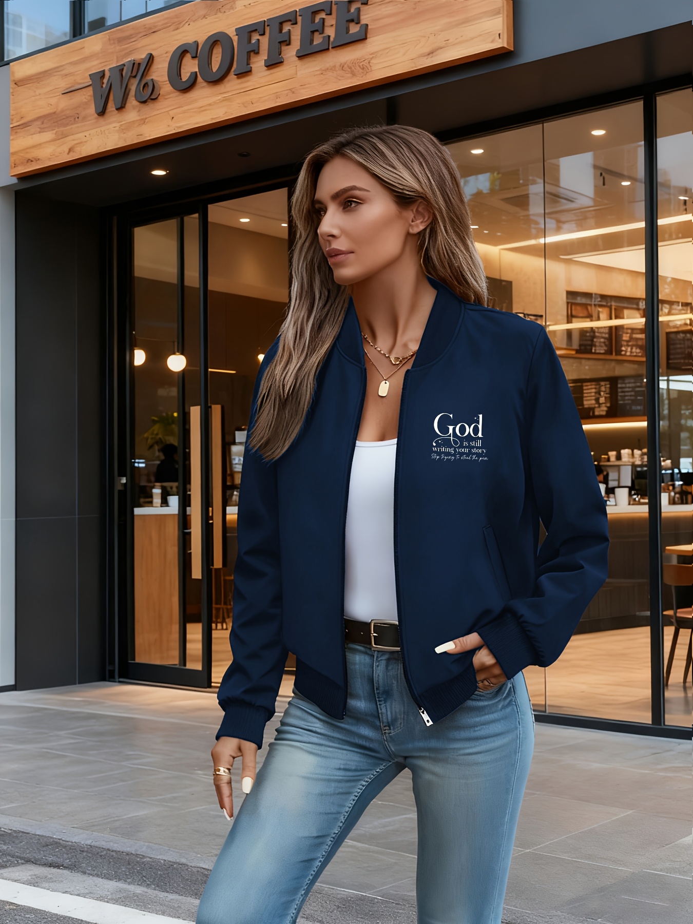 Women's Casual Comfortable Double Print Jacket, Long Sleeve Zipper Stand Collar